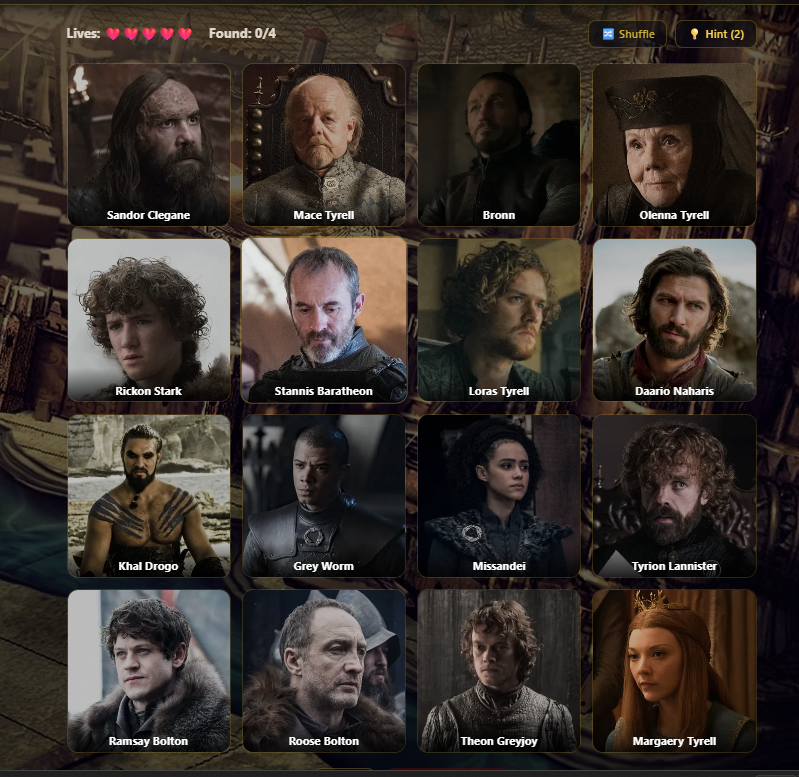 Find 4 hidden groups of 4 cards linked by a theme (house, region, trait…).